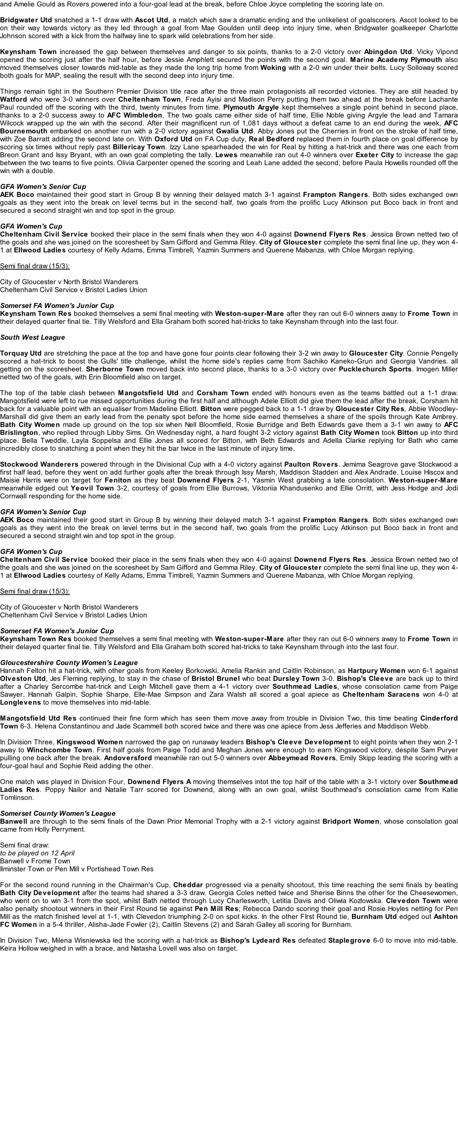 Photos: Keynsham Town (green/white) v Abingdon Utd (yellow) Mangotsfield Utd (maroon) v Corsham Town (blue) AEK Boco (sky blue) v Frampton Rangers (red/black) Bitton (yellow/black) v Bath City (black/white) Women’s & Girls News