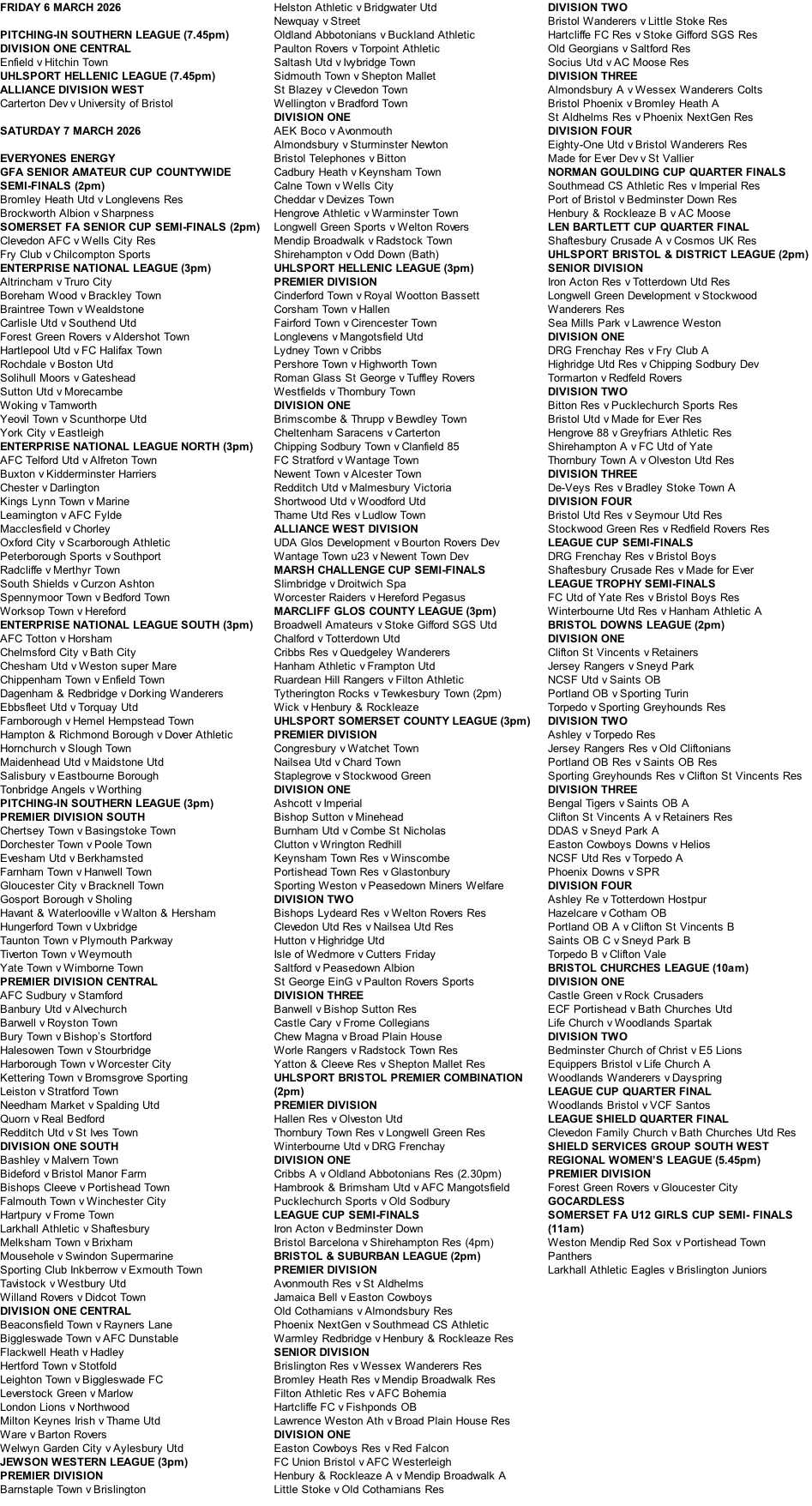Fixtures Saturday 7 March 2026