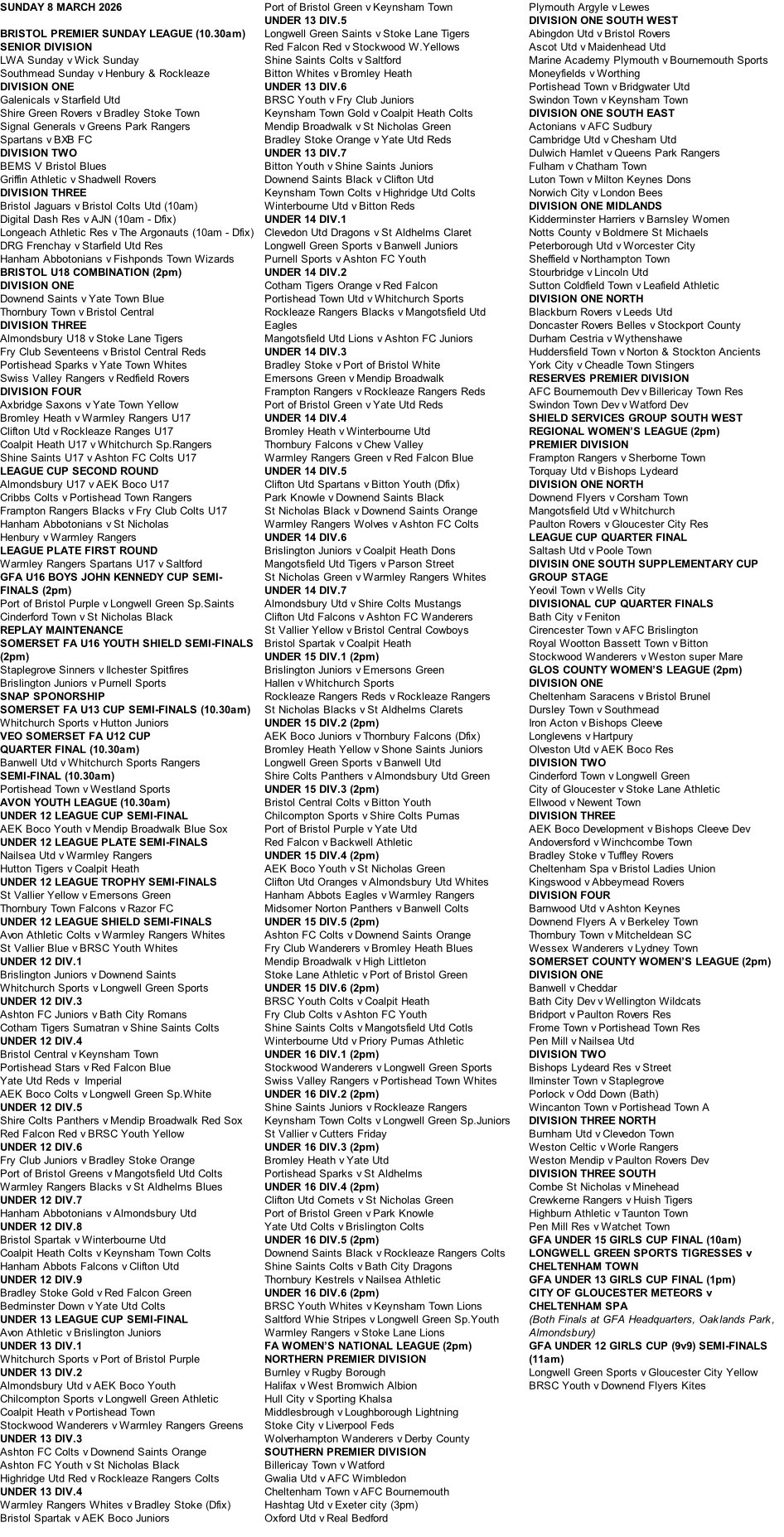 Sunday 8 March 2026 Fixtures