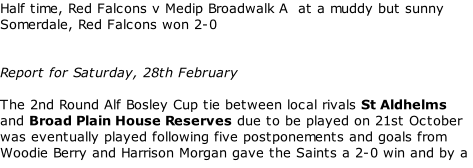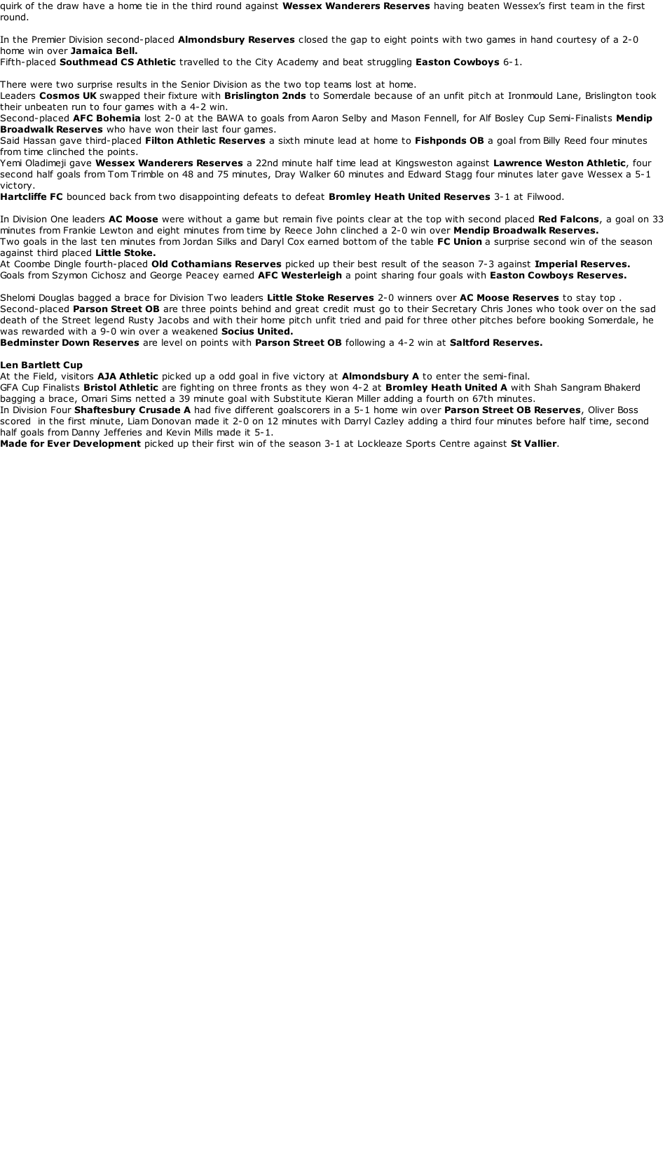 (By Derek Cumner) Almondsbury Res (green/white) v Jamaica Bell (yellow/black) Old Cothamians Res (blue/black) v Imperial Res (white/black)  28-02-2026