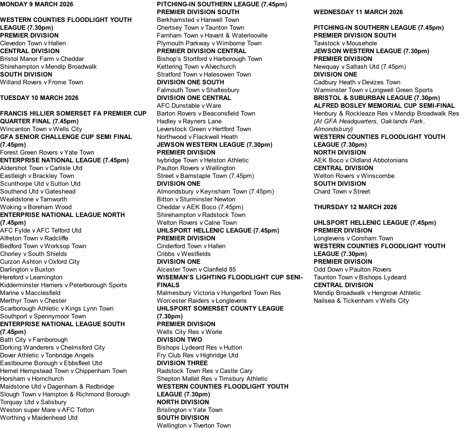 Fixtures Mon-Thurs 9-12 March 2026
