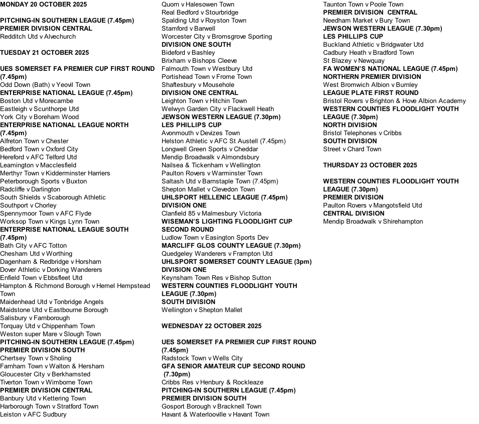 Mon 20 - Thu 23 Oct 2025 Fixtures